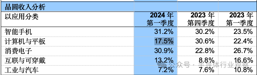 如中芯国际在财报中所说,公司月产能由2023年第四季的805,500片8吋晶圆约当量增加至2024年第一季的814,500片8吋晶圆约当量。其中,智能手机应用贡献了公司最大的营收来源,营收贡献为31.2%。值得一提的是,在上季度,计算机与平板应用贡献了公司最大的营收,贡献比例高达30.6%。但在这季度,这个业务的营收贡献仅为17.5%。从下图可以看到,本季度中芯第二大营收贡献应用是消费电子,贡献了公司30.9%的营收,这是和上季度相比不太相同的点。