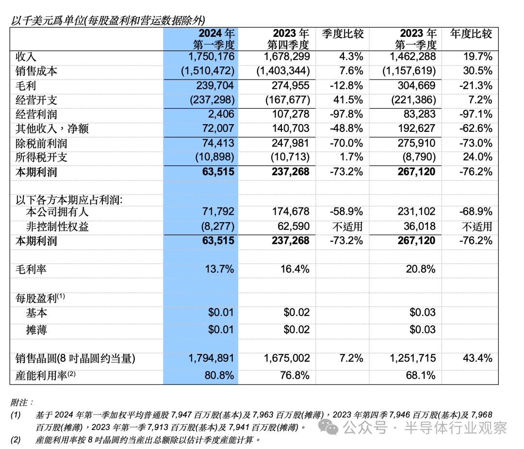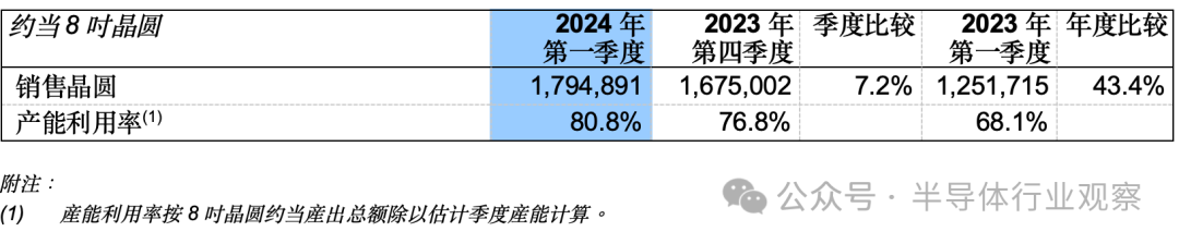 中芯国际管理层表示,2024年一季度全球客户备货意愿有所上升,推动公司销售收入环比增长4.3%;毛利率为13.7%,均好于指引。其中出货179万片8吋当量晶圆,环比增长7%;而产能利用率为80.8%,环比提升四个百分点。