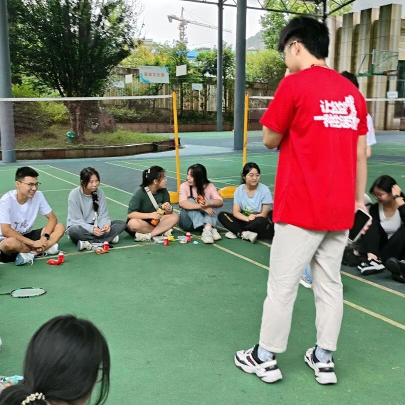 同学们一起来到外面的羽毛球场,马上进行热身活动啦!我们的施蕾学姐拿出了提前准备好的1-16各两份纸条让同学们挑选一张,抽到相同数字的人要相互了解十分钟,随后由主持人随即抽问,答对问题最多者得到小奖品。随即围成了一个大圈开始面对面交流,很是火热,同学们刚开始还有点害羞,不一会儿话匣子就打开了,几位负责人们还为大家准备了丰富的小零食,边吃边聊甚是惬意。