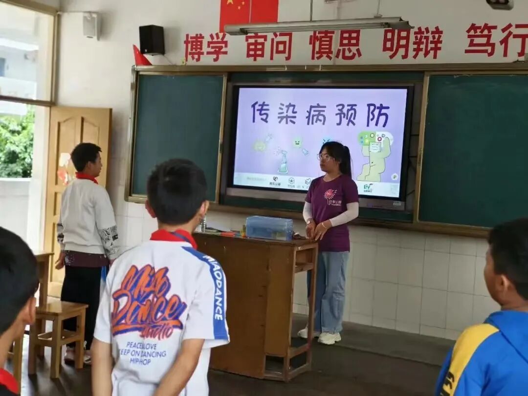 云南大仓小学还有一门传染病预防课,主讲老师杨国会。由一个视频引入,带同学们了解传染病各种意想不到的传染方式,重点讲解了引发19年新冠疫情的冠状病毒COVID-19。在思维风暴环节中,队员启发同学们思考面临突发公共卫生事件时,我们应该以什么样的心态去应对、采取什么样的措施去防范。