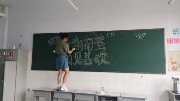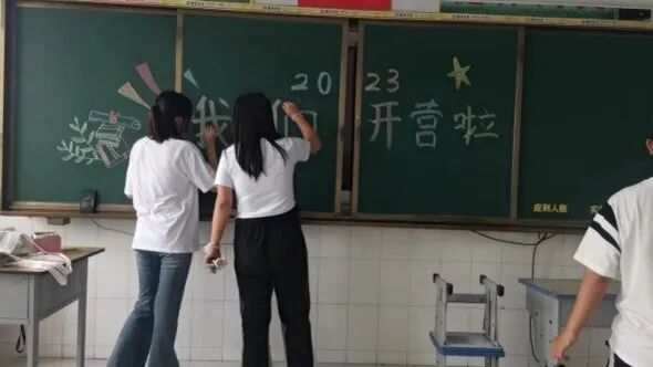 开营前的志愿者们早就到达学校,在学生到来之前把教室打扫整洁,布置环境;黑板上五颜六色的粉笔描绘出期待中的夏天的模样。