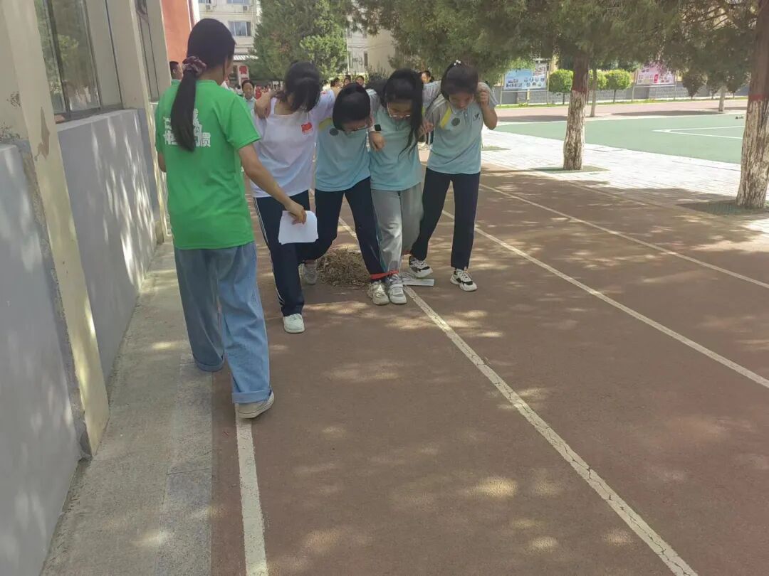 在进行低年级的“三人四足”和高年级的“四人五足”比赛时,两个小朋友的一只脚绑在一起,四个人肩并肩,你一步我一步地向终点迈进,考验了同学们的协作能力。