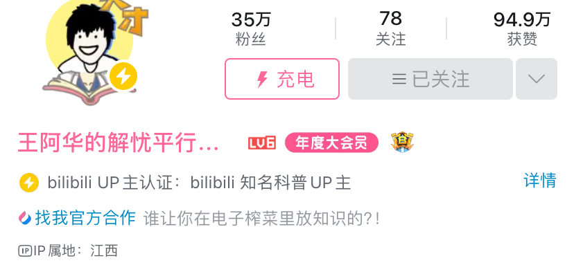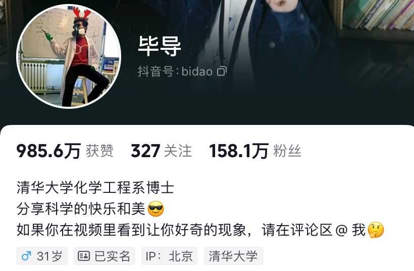 【推荐理由】这是一个连文科生都喜欢的科普博主!在“毕导”的世界里,科普不仅仅是传递知识,更是一种艺术和娱乐的结合。他经常与其他领域的创作者进行跨界合作,将科学与音乐、舞蹈、电影等完美结合,创造出全新的科普体验,这不仅拓宽了科普的边界,也让观众在欣赏艺术的同时,感受到了科学的无限可能。