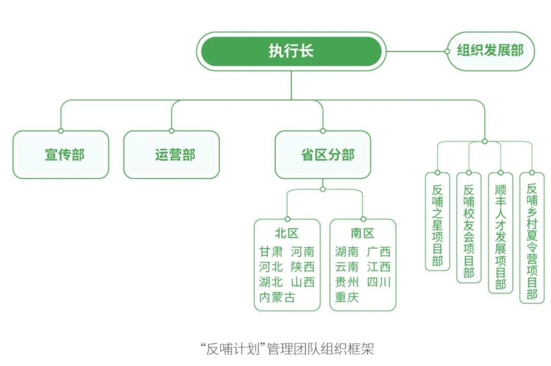 反哺计划管理团队更像是一个自愿加入、自我成长、帮助他人的全国性的大学生社团,由顺丰公益基金会给予工作指导、资源对接和资金支持,期望培养自信、正直,并能积极融入社会、勇于担当的大学生。