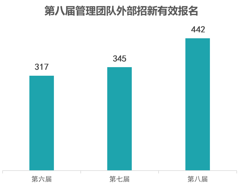 本次第八届管理团队外部招新共收到442份有效报名表,相比第六届增加了125人,相比第七届增加了97人,这一届的报名人数增幅有了很大的提高。