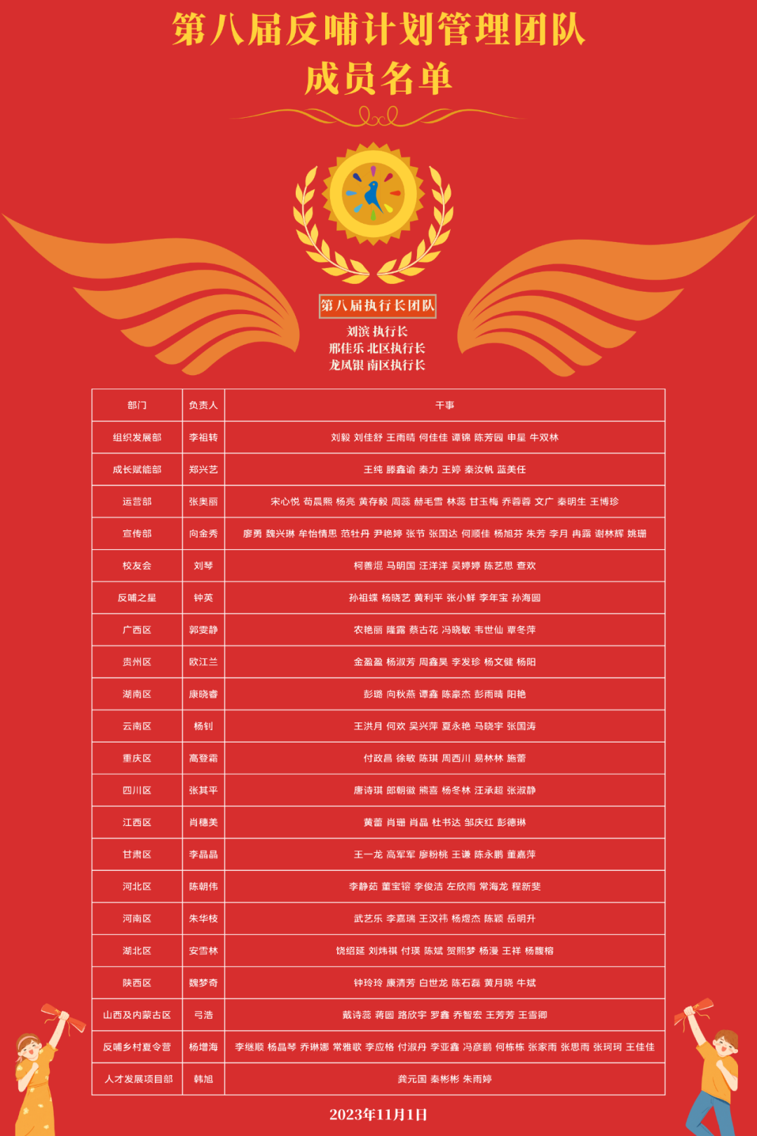 欢迎各位小伙伴加入管理团队大家庭!经过笔试、面试和考核,我相信你们对这个大家庭也有了更深一步的了解,那么我希望在接下来的一年,你们可以寻找到自己的热爱,在这里找到自己,找到知己,能在管理团队学到很多在学习生活中不能学到的东西,拥有一段不一样的经历。希望我们可以齐心协力去做好第八届反哺计划管理团队的工作,我们一起加油,坚持把简单的事情做好就是不简单,坚持把平凡的事情做好就是不平凡。愿你们保持最初的热忱,一直奔跑在路上。没有入选管理团队的小伙伴们也不要灰心呀,反哺计划一直都是你们的家,也会一直陪伴着你们成长,前路浩浩荡荡,万物皆有期待,希望你们也可以怀着希望前行,在自己的领域熠熠生辉。