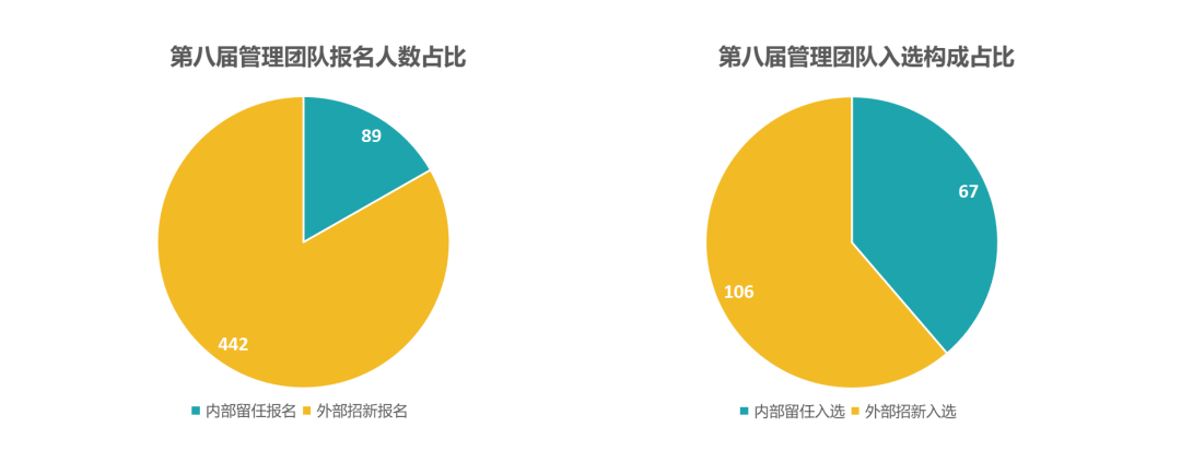 从左图中可以看出,第八届管理团队报名人数中,外部招新占比相对较大,其中外部招新报名人数442人,内部留任报名89人。从右图可以看出,第八届管理团队入选构成中,外部招新成员占比相对较大,其中外部招新入选106人,内部留任入选67人。