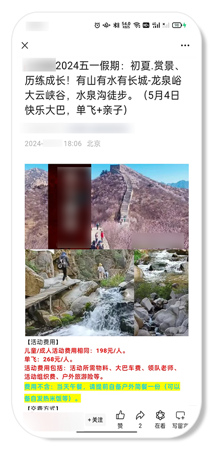 组织团体户外活动应选择合法合规且具备一定成熟性和安全性的路线/地点,避免相关人身风险。
