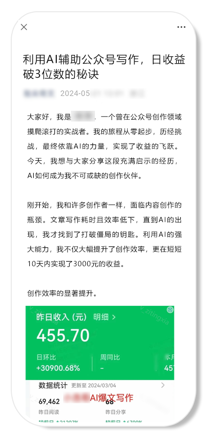以AI技术等为噱头,宣扬可以批量生成或制造爆款文章。但实际是通过夸大描述、宣传与实际不符的收益或成果,诱导用户购买相关课程或服务。