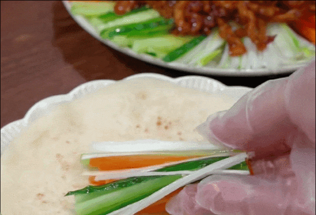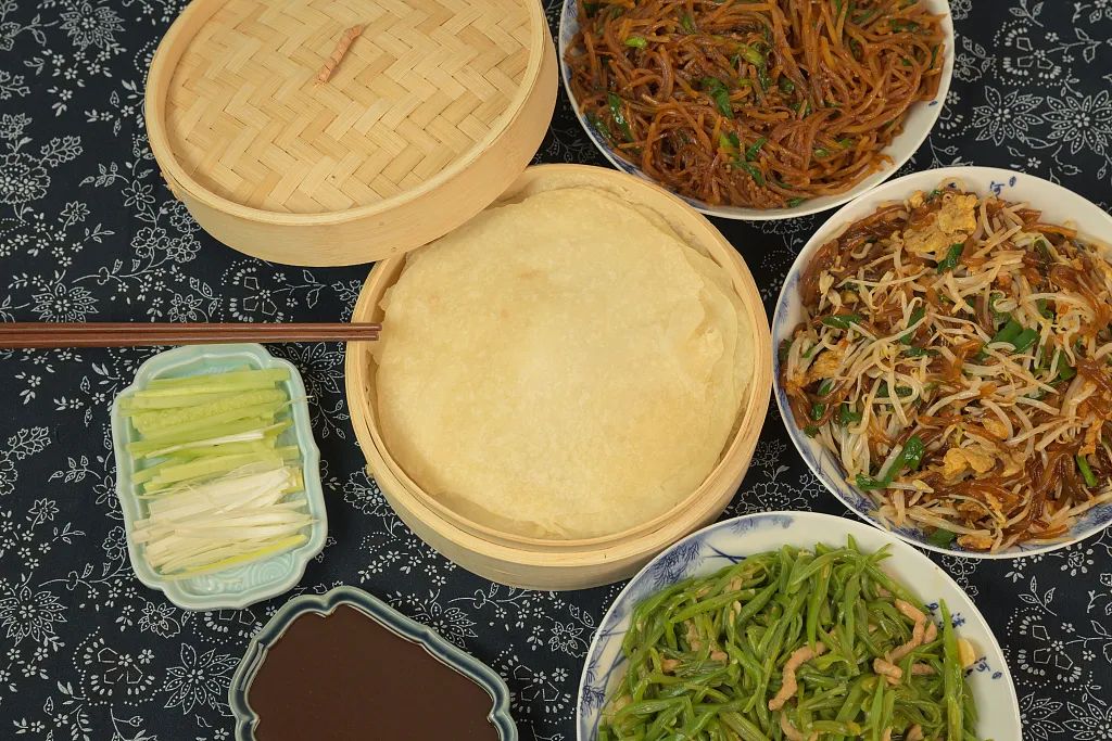 以荷叶薄饼卷食”