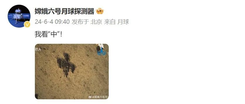 嫦娥六号完成月背采样之后,月表呈现一个“中”字。@嫦娥六号月球探测器 :我看“中”!