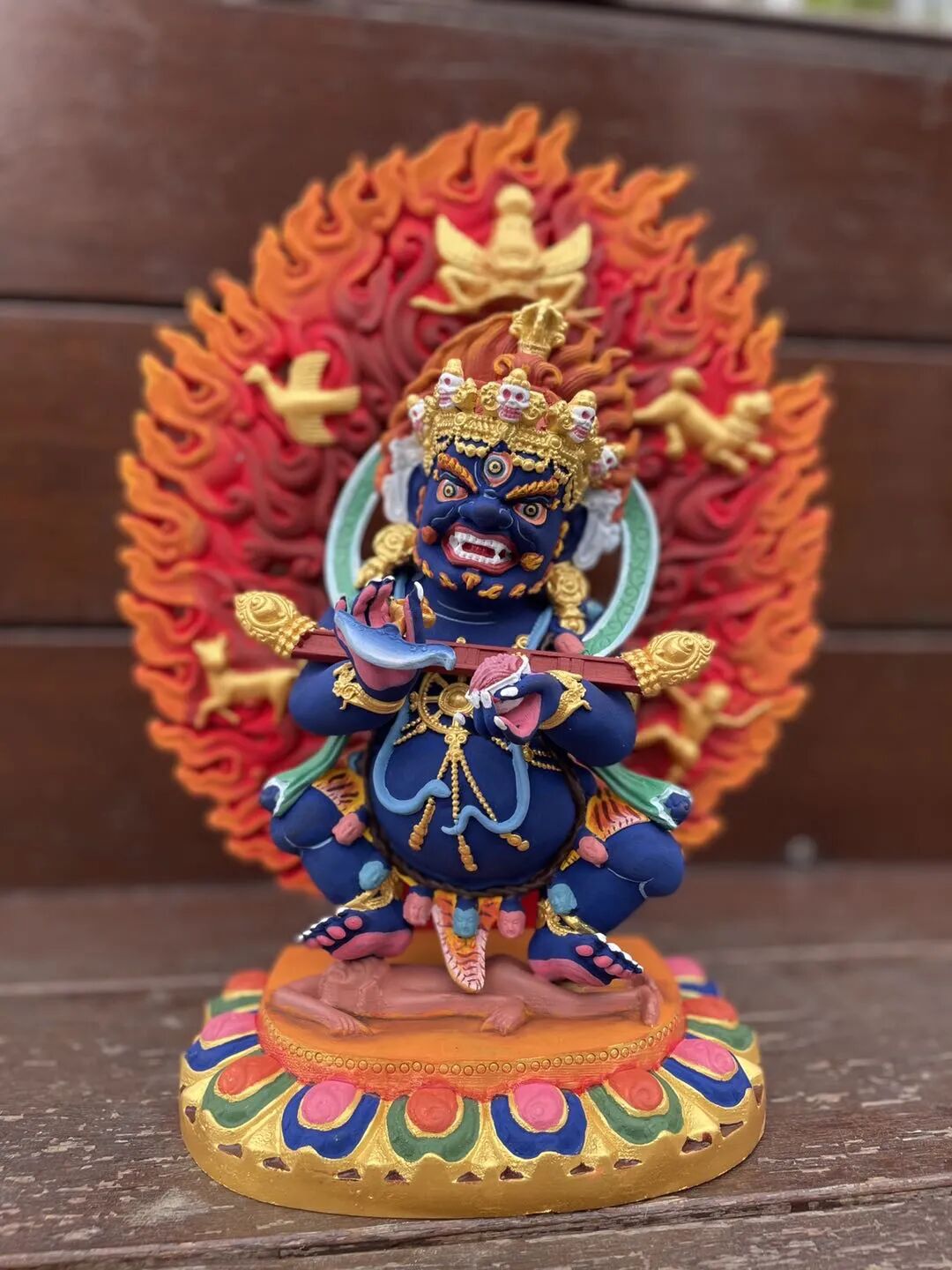 那么,该供什么护法好呢?若是宁玛巴,最好供三大护法——丹坚、阿仲玛、惹哈拉以及格萨尔王;如果是萨迦巴,最好供二臂玛哈嘎拉、犀甲、这些都是佛的化身,对我们的修行只会有帮助,不会有违缘。如果不想念那么多仪轨,也可以只念格萨尔王的修法仪轨。包括麦彭仁波切与法王如意宝在内的很多宁玛巴的高僧大德的护法,就是这些了。