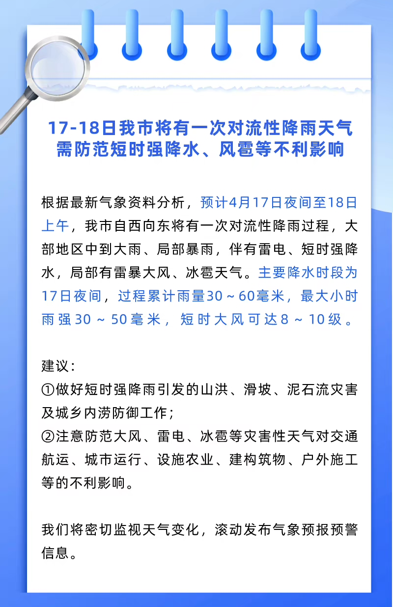 预计今天午后至明天白天,我省将有一次对流性降雨过程,伴有雷电、短时强降水,中东部局部有雷暴大风、冰雹天气。对流天气自西向东影响我省,今天午后,鄂西和江汉平原南部有小到中雨、局部大雨,夜间东移至我省中东部,有中到大雨、局部暴雨。预计过程累计雨量中东部30~70毫米,西部10~30毫米,较大降水区主要位于荆州、荆门、天门、潜江、仙桃、随州、孝感、武汉、黄冈等地,最大小时雨强40~60毫米,短时大风可达8~10级。