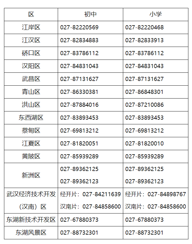 武汉市义务教育入学招生咨询电话一览表