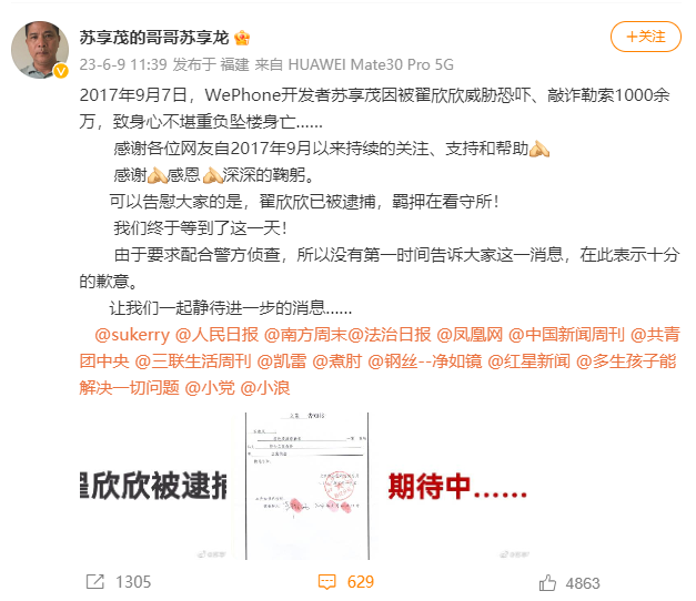 6月9日11时39分,苏享茂哥哥苏享龙在第三方社交平台个人主页发布文字和图片,称翟欣欣已被海淀警方逮捕。