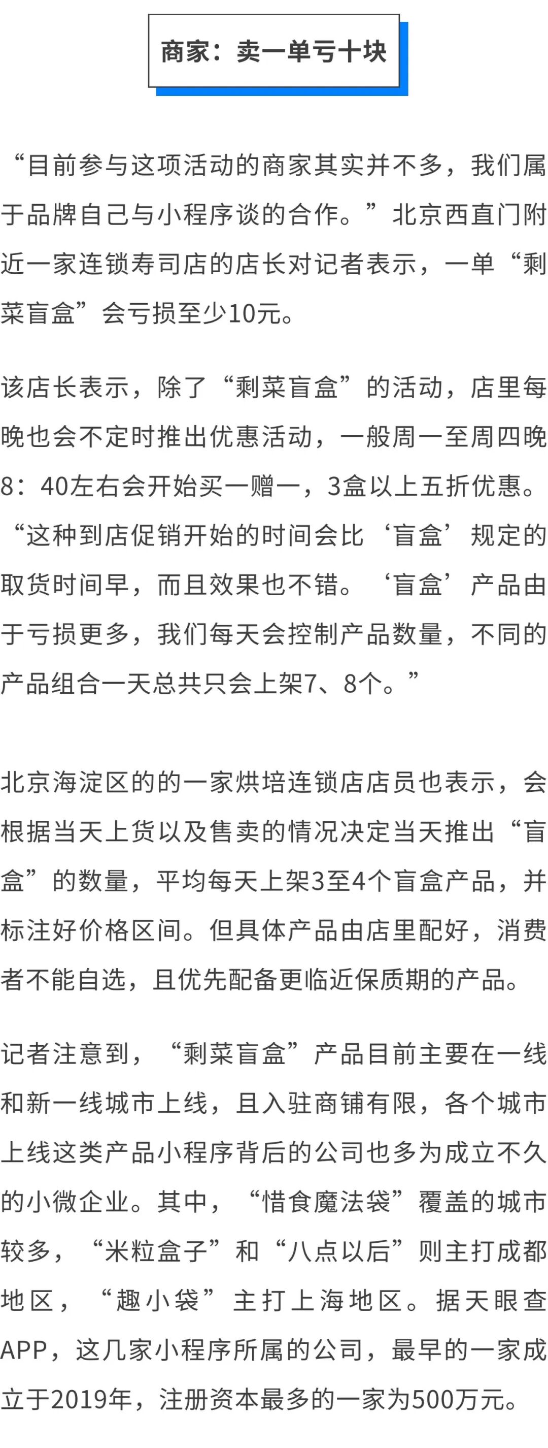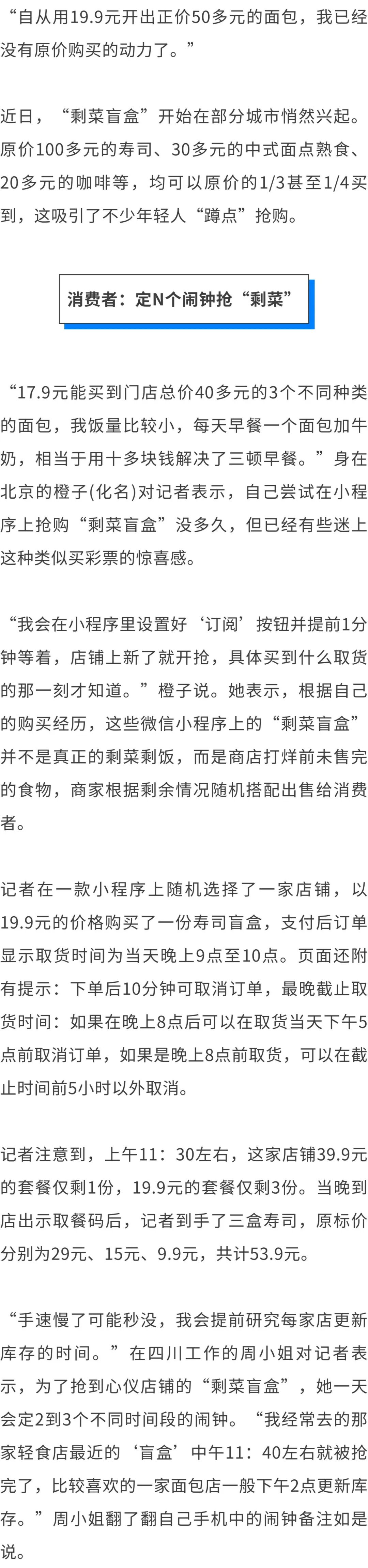 “不是所有的食品都适合以盲盒形式出售。比如面食、快餐等,很容易因储存、包装、标注不当引发质量问题。”艾媒咨询集团CEO兼首席分析师张毅在接受媒体采访时表示,剩菜盲盒作为解决临期食品的促销活动,对减少食品浪费,不失为一种有益的尝试,但其一切的前提应在食品安全的规制内。