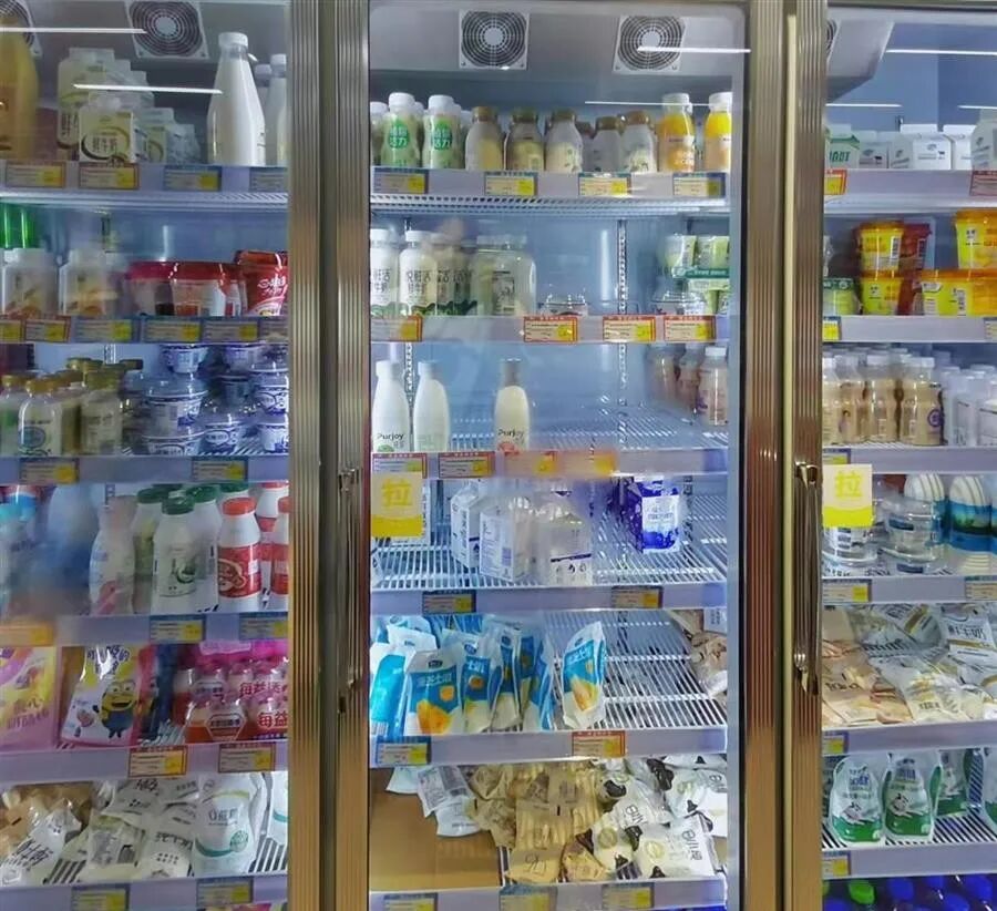超市冰柜里丰富多样的酸奶产品
