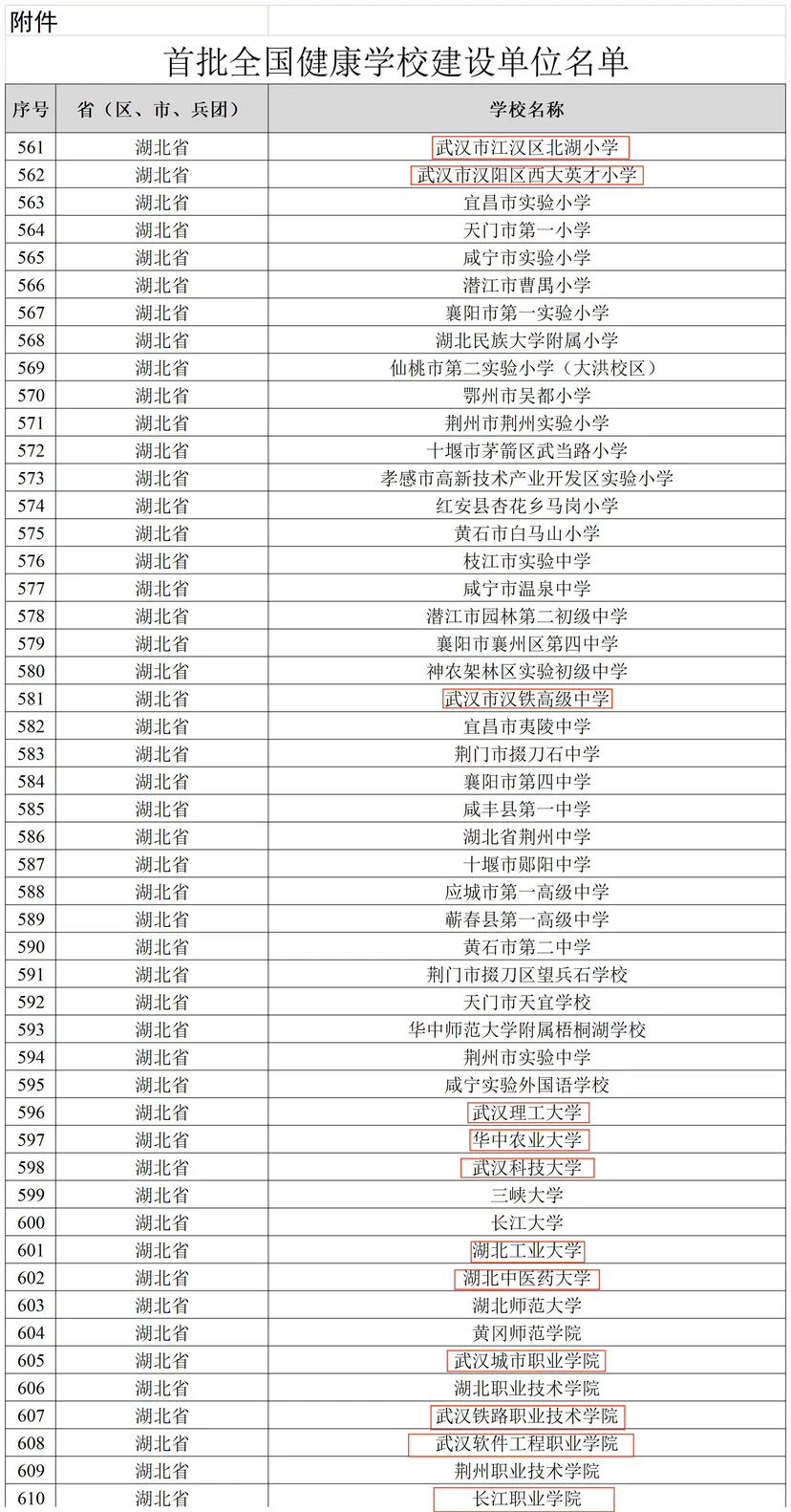 名单显示,在学校自主申报、各省级教育部门遴选推荐、专家组审核、网络公示基础上,此次有1075所学校被确定为首批全国健康学校建设单位,建设周期为2年。湖北有50所学校入选,其中12所在武汉,具体如下: