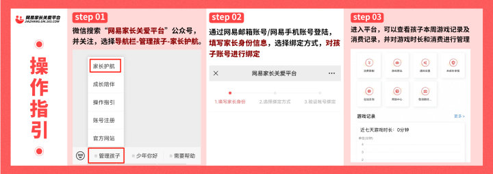 家长可通过微信搜索公众号“网易家长关爱平台”,即可对孩子的游戏行为进行管理,这个过程快捷简单,仅需要三步就能完成: