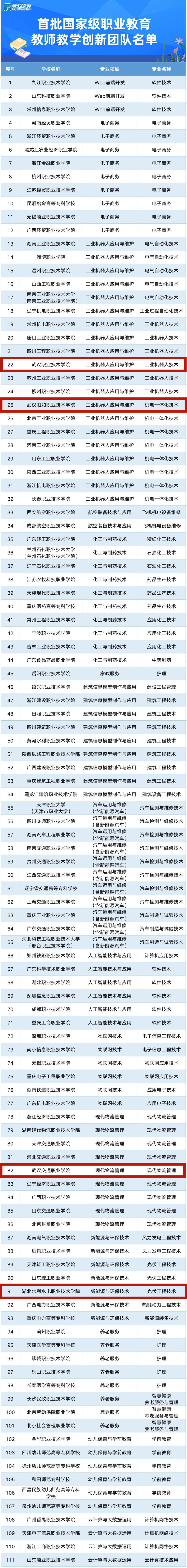 日前,教育部公布首批国家级职业教育教师教学创新团队(以下简称“国家级团队”)名单,确定国家级团队111个。其中,武汉有4所学校的团队入选,分别是:武汉职业技术学院、武汉船舶职业技术学院、武汉交通职业学院、湖北水利水电职业技术学院的团队。