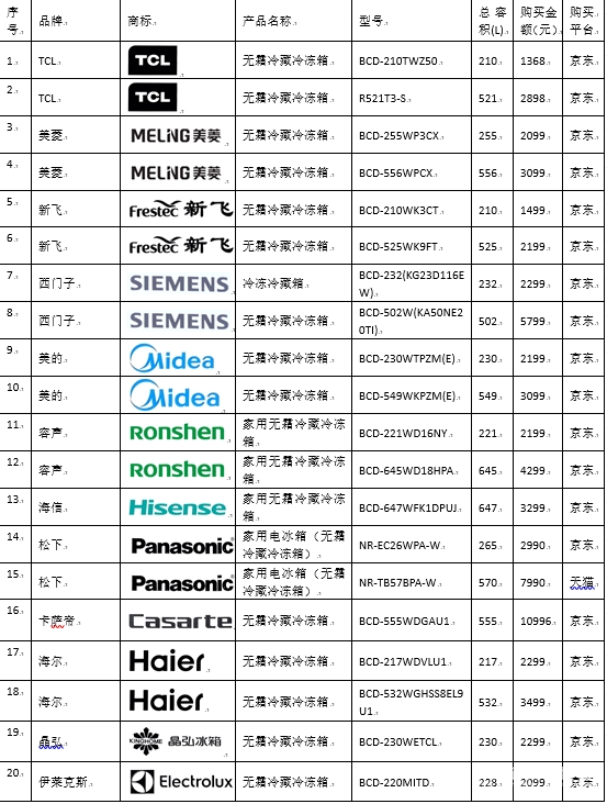 据中消协网站,本次试验的样品由中消协工作人员以普通消费者身份购买自京东、天猫互联网平台,样品中包含10款单开门冰箱(210L~265L),12款双开门冰箱(502L~647L)。售价最高为10996元,最低为1368元。样品情况见下表。
