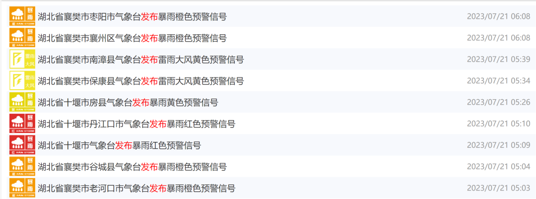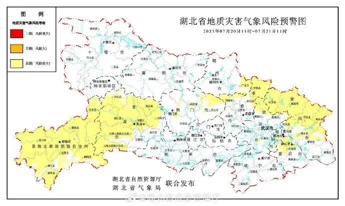 2023年7月20日11时—7月21日11时,预计三峡库区、恩施地区、鄂州市、宜昌(宜昌市城区、长阳、五峰、远安、当阳)、荆门(荆门市南部城区、钟祥中南部、京山)、随州(广水)、孝感(安陆、孝昌东北部、大悟)、武汉(黄陂北部、新洲北部、青山、江夏)、黄石(黄石市城区、大冶)、黄冈(黄州区、红安、麻城、团风、罗田、英山、浠水、蕲春北部)以及其他强降水区域发生崩塌、滑坡、泥石流的风险较大,请相关地方政府及有关部门按照《湖北省地质灾害气象风险预警响应工作方案(试行)》,做好预警响应工作。