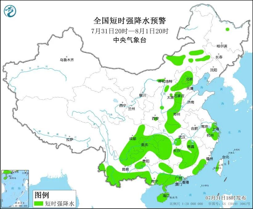 【强对流天气黄色预警】7月31日20时至8月1日20时,内蒙古中东部和南部、黑龙江北部、北京东部、天津北部、四川盆地东南部、重庆西部等地的部分地区将有8至10级、局地11级以上雷暴大风或冰雹天气;内蒙古中南部、陕西中东部和南部、山西北部和东部、河北、北京、天津北部、河南中西部、江苏南部、上海、湖北中西部、湖南、江西、浙江北部、福建南部、四川中东部、重庆南部、贵州北部和西南部、云南、广西西南部和东部、广东北部和西南部沿海、海南岛、台湾岛西部等地的部分地区将有短时强降水天气,小时雨量30至60毫米,局地可达70毫米以上。