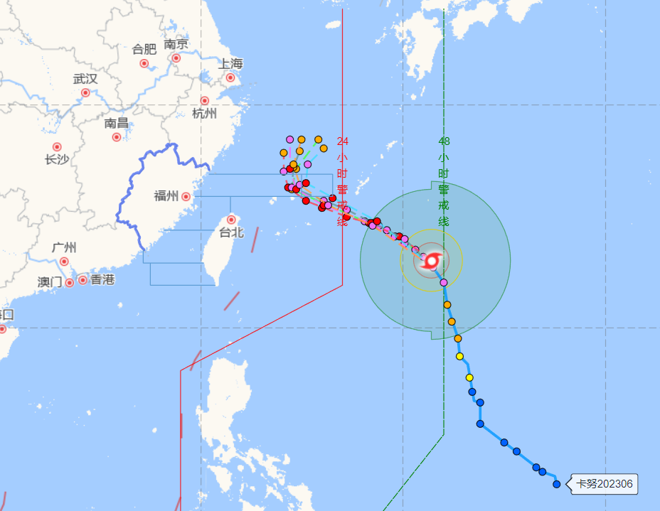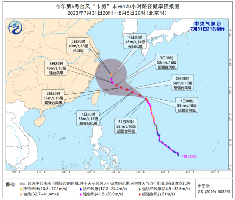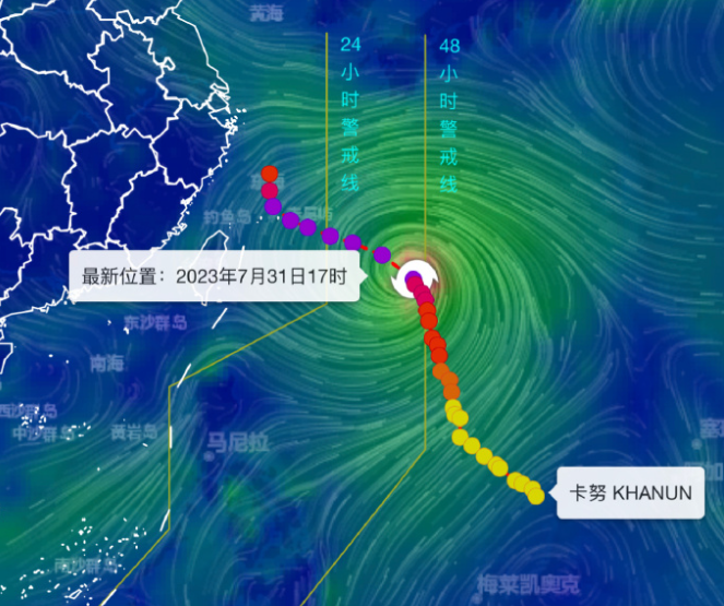 7月31日17时,“卡努”中心距离琉球群岛那霸市东南方向约510公里,强度加强为超强台风级,最大风力达到16级,最大风速52米/秒。预计“卡努”将以每小时15—20公里的速度向西北方向移动,强度有所增强。