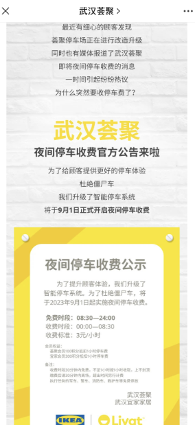 针对这一现象,8月1日,武汉荟聚官方微信发布公告,停车场将从9月1日起正式开启夜间停车收费。公告解释,武汉荟聚拥有5000个停车位,但在顾客调研中常收到停车困难的反馈,经查发现,停车场内聚集了一些过夜车、僵尸车占用车位,因此决定执行夜间停车收费的措施。