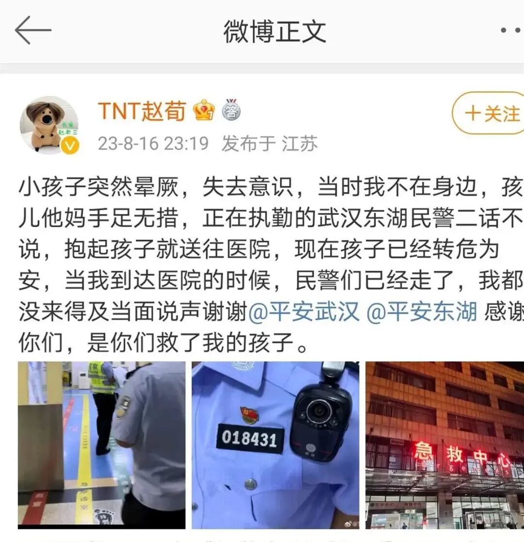8月16日晚上11时19分许,知名演员赵荀在微博发文,@平安武汉、@平安东湖,感谢民警及时出手施救,在危急关头及时将他的孩子送医救治。