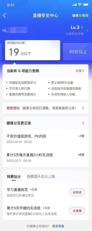 健康分加分渠道和方式保持不变,通过相应主播资质申请的主播,主播当前分值不变,总分上限进行相应的调整。加分方式为:无违规加分、教育扣分减免、申诉回分、认证激励等。