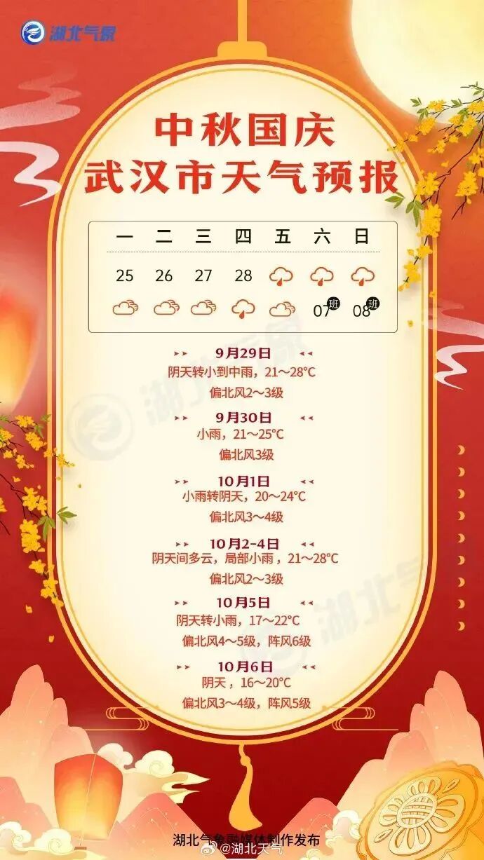 预计中秋和国庆假期(9月29日-10月6日)武汉市云量较多,部分时段有降水发生,但出现强降水天气的可能性较小。