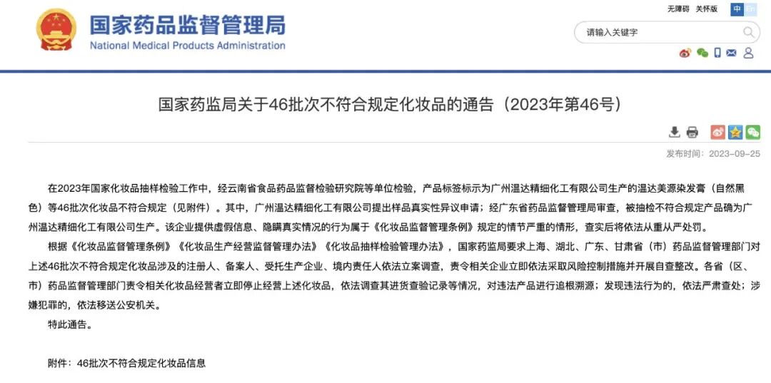 通告指出,在2023年国家化妆品抽样检验工作中,经云南省食品药品监督检验研究院等单位检验,产品标签标示为广州温达精细化工有限公司生产的温达美源染发膏(自然黑色)等46批次化妆品不符合规定。