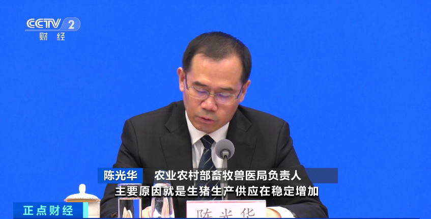 农业农村部畜牧兽医局负责人 陈光华:主要原因是生猪生产供应在稳定增加,作为(生猪)产能的核心指标,9月末,(全国)能繁母猪存栏量4240万头,比4100万头正常保有量高出3.4%。同时,母猪生产效率也在提升。在两个因素共同作用下,猪肉产量处于近年同期高位,前三季度猪肉产量4301万吨,同比增长3.6%。