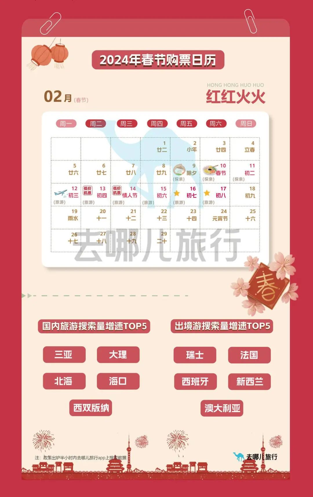 10月25日,国务院办公厅发布关于2024年部分节假日安排的通知。去哪儿数据显示,通知发布后不到半小时,去哪儿平台上2024年春节期间的火车票、国际机票搜索量瞬时增长翻倍,且仍在冲高;上海、长沙已经出现第一波购票的旅客。武汉等大城市在假期成为适合出游目的地。