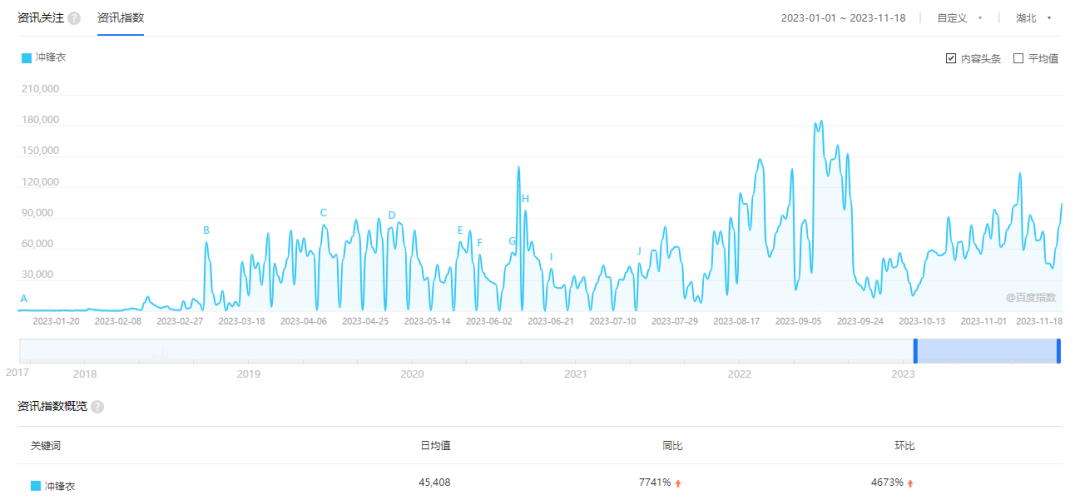 今年以来,湖北地区冲锋衣资讯指数 来源:百度指数