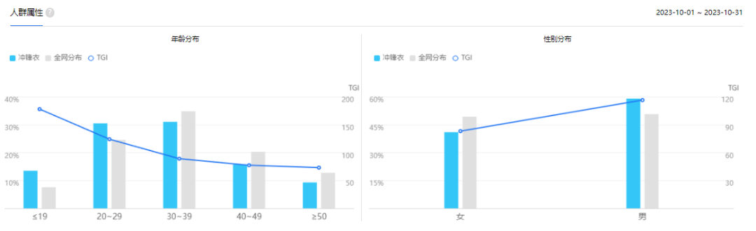 今年10月全国冲锋衣相关人群属性。来源:百度指数