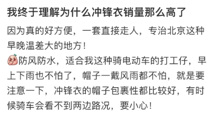 正在挑选冲锋衣的陈女士告诉记者,自己是一名小学老师,每天骑电动车通勤。“这几天降温,每天早晨骑车真的都缩手缩脚,所以赶紧来买件冲锋衣。”陈女士称,“前几年冲锋衣款式太少,女生都爱美,所以不怎么愿意购买。但是今年不一样了,冲锋衣做得很亮眼,让人忍不住想买。”与羽绒服不同,冲锋衣的防水性能,也是陈女士所看中的。“下点小雨,冲锋衣抖一抖就干了。”