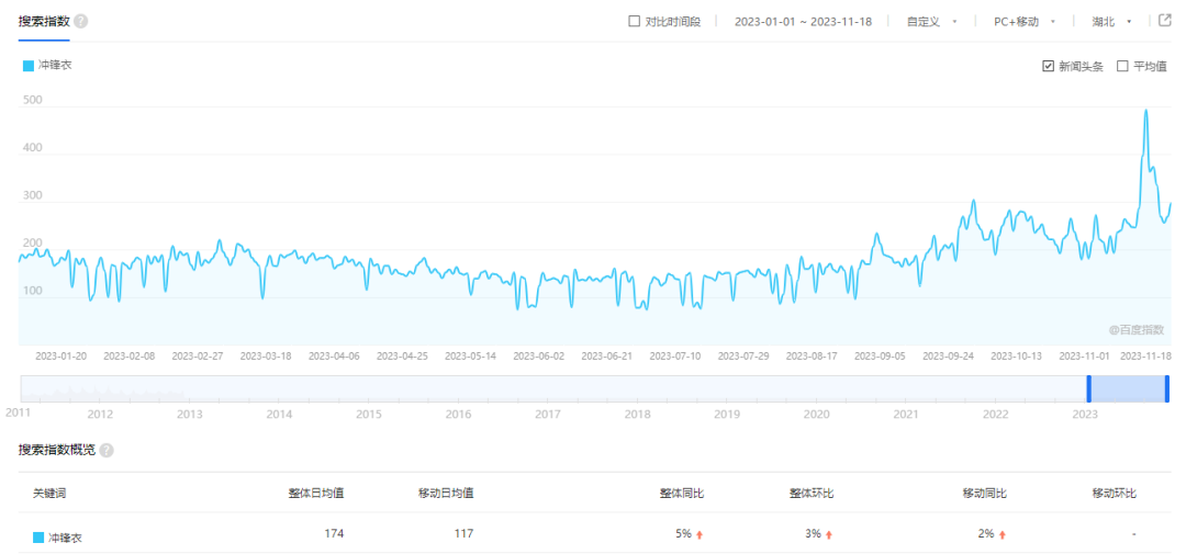 百度指数显示,今年以来,冲锋衣日均搜索指数超过了1250,反超羽绒服。在湖北,冲锋衣日均搜索指数为174,资讯指数同比大幅增长约7741%。