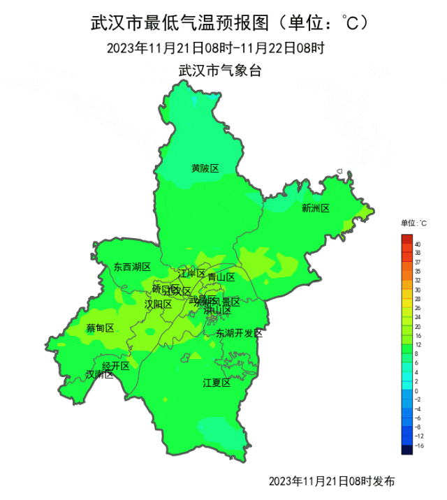 11月22日夜间至11月25日,武汉市气温将逐步下降,并伴有大风。过程平均气温降幅6~9℃,24日和25日大部地区最高气温将降至13~14℃,最低气温北部2~4℃,南部4~6℃;