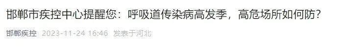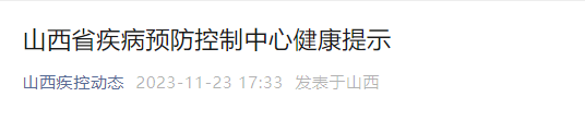 11月23日,“山西疾控动态”微信公众号发布健康提示:为积极做好秋冬季呼吸道传染病防控工作,山西省疾病预防控制中心健康提示公众和相关单位要积极采取科学、规范的防控措施。