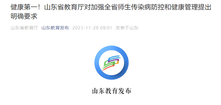 11月27日,山东省教育厅印发通知,倡导广大师生牢固树立“健康第一”的教育理念,有效应对当前山东省多种传染病叠加流行风险,最大限度保障师生安全健康。