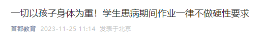 11月25日,“首都教育”微信公众号发文,强调一切应以孩子身体为重,学生患病期间作业一律不做硬性要求。详细内容如下: