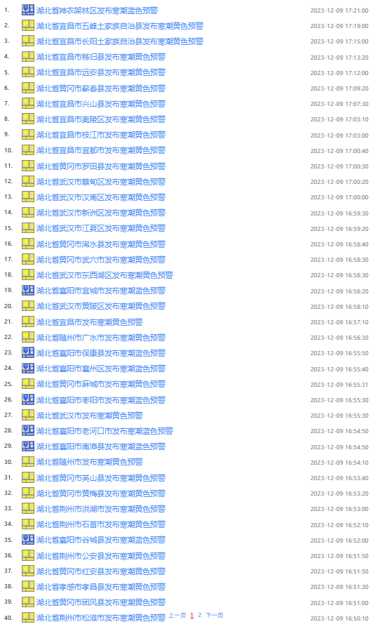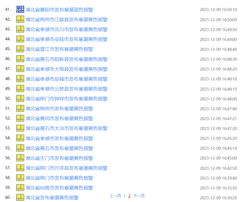 截至17时40分,湖北连发60条寒潮预警信息,武汉、宜昌、襄阳、荆州、黄冈等地发布寒潮预警。