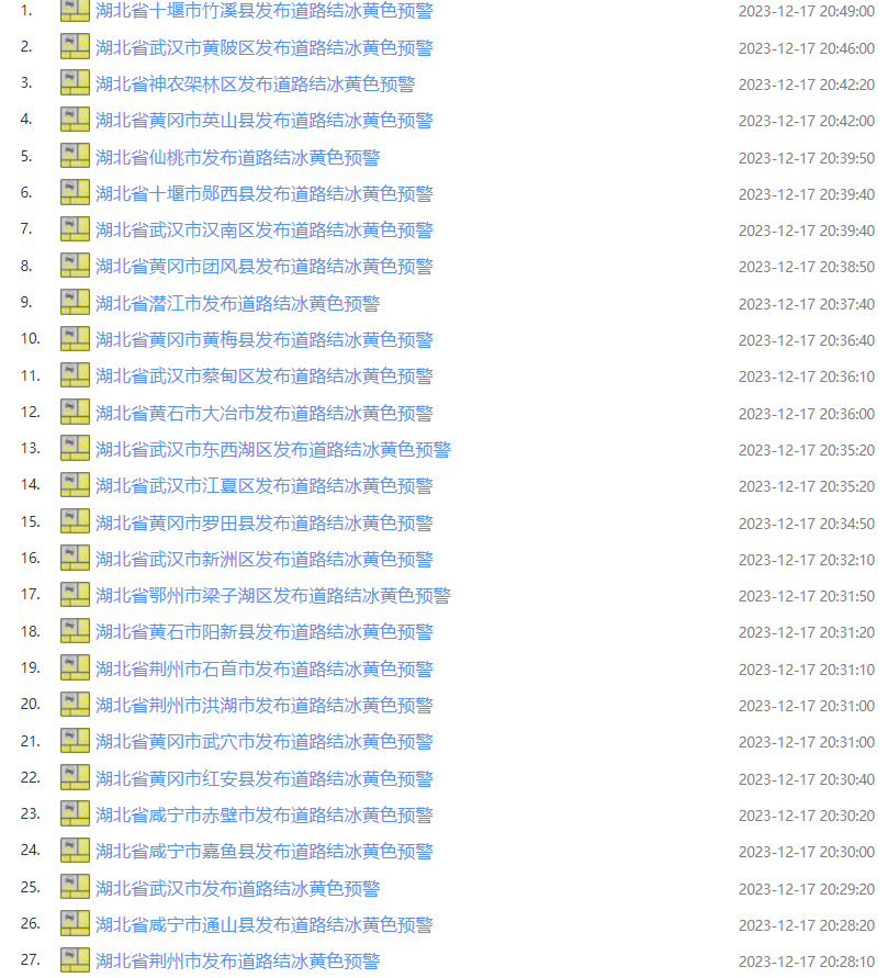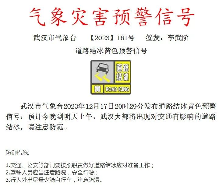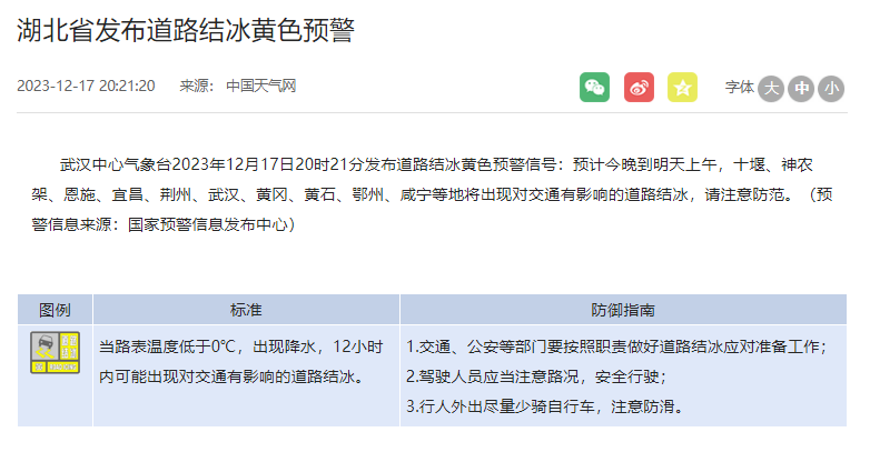 湖北发布道路结冰黄色预警信号