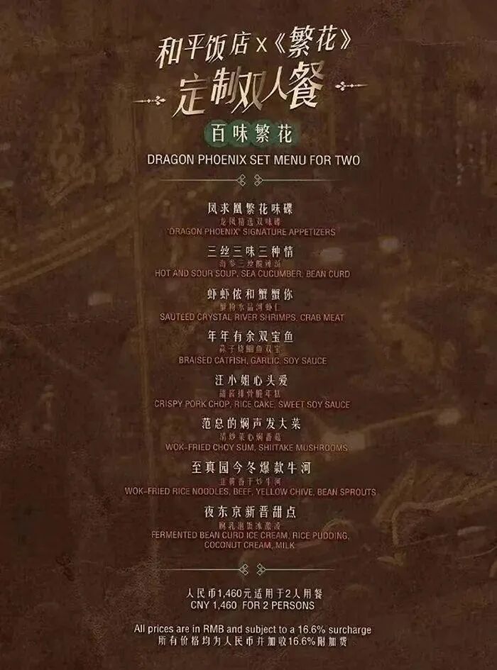此外,和平饭店顺势推出了与《繁花》联名的定制双人餐,售价1460元,并加收16.6%的服务费,即总价1702元。该套餐中,包括剧中经常出现的干炒牛河、排骨年糕等菜品,以此将追剧的观众转化为和平饭店的客人。