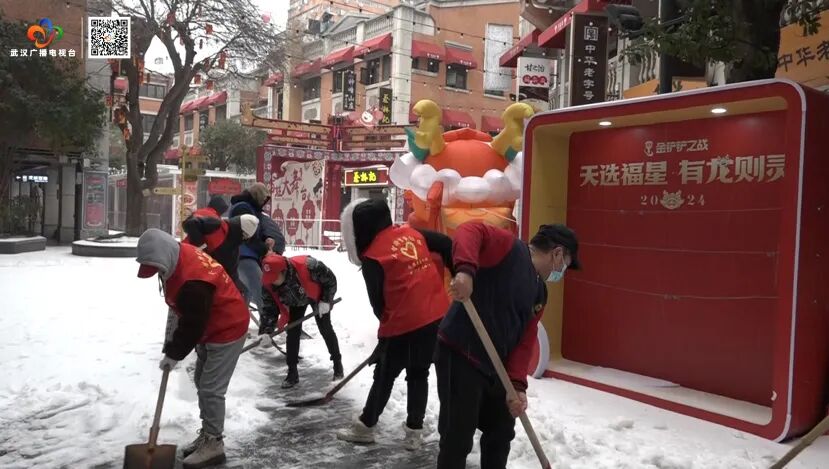 武商集团员工纷纷上路铲雪,铺设麻袋。保障市民安全出行,方便市民购物。