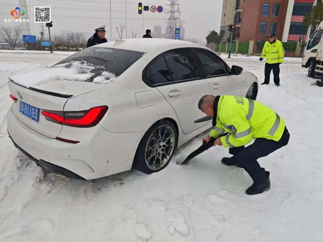 上午10时许,武汉经开区交通大队纱帽中队民警巡逻时,发现一辆宝马小轿车在路口因积雪打滑。民警万俊杰急中生智,从警车后备箱拿出平时用于防爆的盾牌当铲雪工具,帮助打滑车辆铲除积雪,然后将车辆推至安全地带。