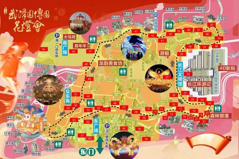 建议大家绿色出行地铁7号线园博园(汉口里)站可直达。2月24日至25日,打铁花因场地原因取消,大马戏、龙狮献瑞、十二呈祥国风秀、汉口里、龙韵美食坊、长江环游记正常营业。17:00花灯准时亮起,雪中观灯。另外,杭州园旁祥鹤岛梅花正开。