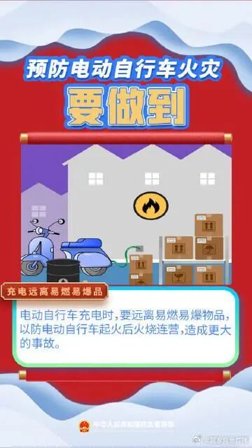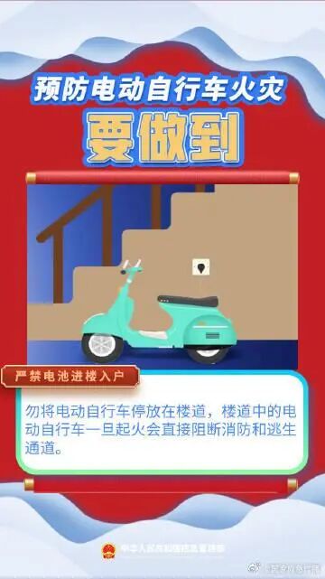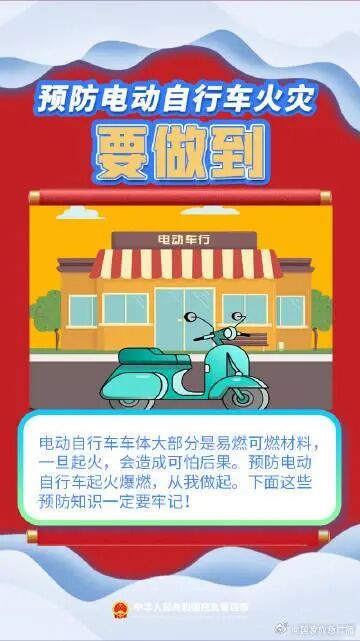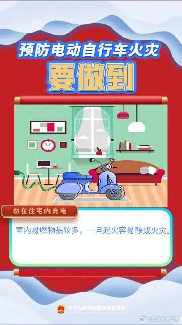 为预防电动自行车火灾,保障人民生命财产安全,根据《中华人民共和国消防法》等法律法规,就加强电动自行车消防安全管理明确“五个严禁”: